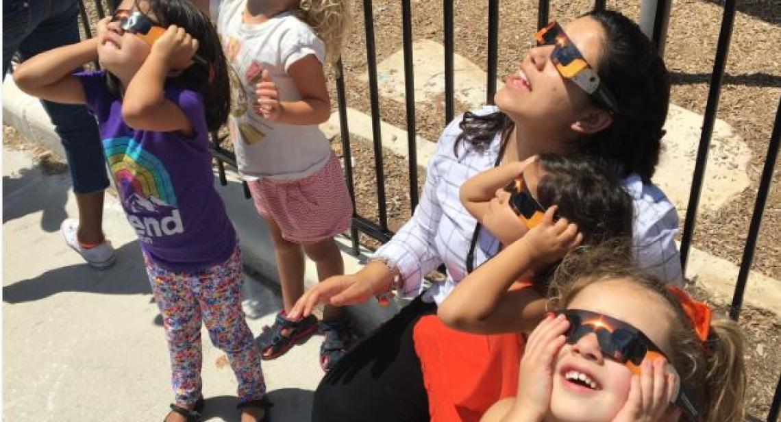 The Lavaca Bluebonnets (pre-k) class observe the solar eclipse with special viewing glasses.